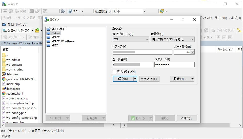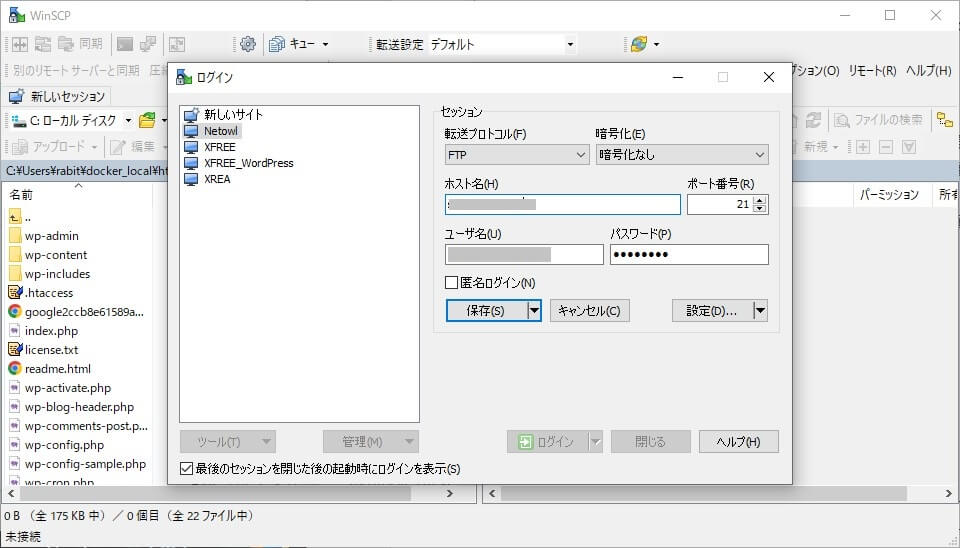 FTP通信用ツールは有名どころのWinSCPを使用しています。設定等の詳細は各サーバー毎に多少異なりますので今回は説明を省きます。