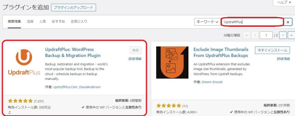 キーワードのところに、「UpdraftPlus」と入力し、下の図の赤枠で囲まれたプラグインをインストールします。