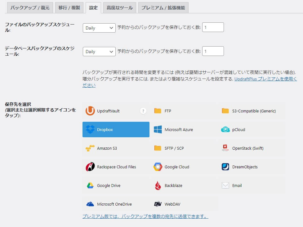 「設定」タブを押し、バックアップ先を決めます。筆者の場合は、Dropboxを使用しました。