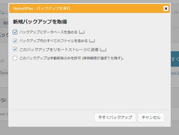 次のような画面が出ますので、「バックアップにデータベースを含める(...)」「バックアップ内のすべてのファイルを含める(...)」「このバックアップをリモートストレージに送信(...)」の3つにチェックを入れ、「今すぐバックアップ」を押します。