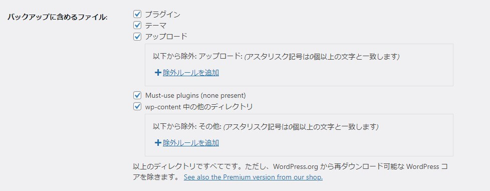 バックアップに含めるファイルとして、「プラグイン」「テーマ」「アップロード」「Must-use plugin (none present)」「wp-content 中の他のディレクトリ」を指定します。