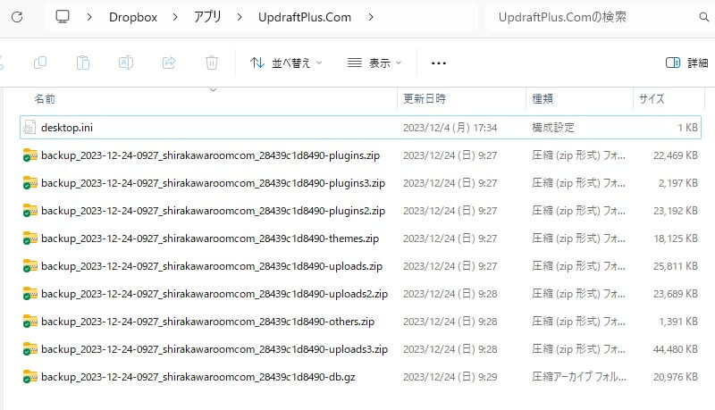 Dropboxのフォルダ内の「アプリ」>「UpdraftPlus.Com」の下に、上の図のバックアップファイルが作成されていることを確認してください。