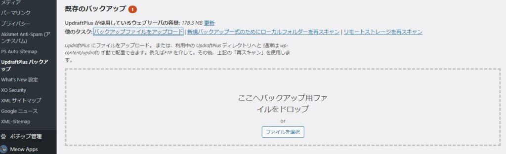 既存のバックアップから「バックアップファイルをアップロード」を押し、「ここへバックアップ用ファイルをドロップ」へ、ドラッグ&ドロップでバックアップしたファイルを放り込んでいきます。