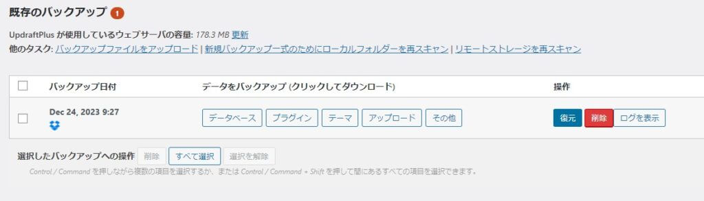 まず、バックアップファイルがアップロードできたかを確認します。「データベース」「プラグイン」「テーマ」「アップロード」「その他」があることを確認してください。