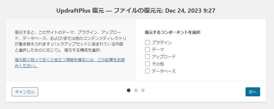 復元するコンポーネントを選択から、「プラグイン」「テーマ」「アップロード」「その他」「データベース」にチェックを入れて、「次へ」を押します。
