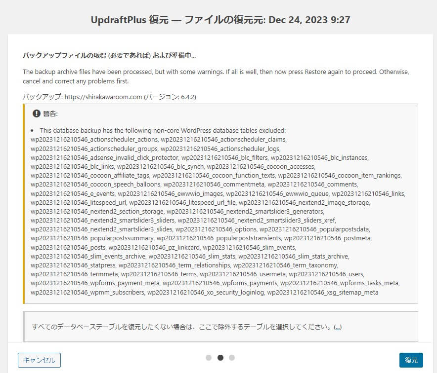 警告が出ますが、「復元」を押して環境の移行を行います。