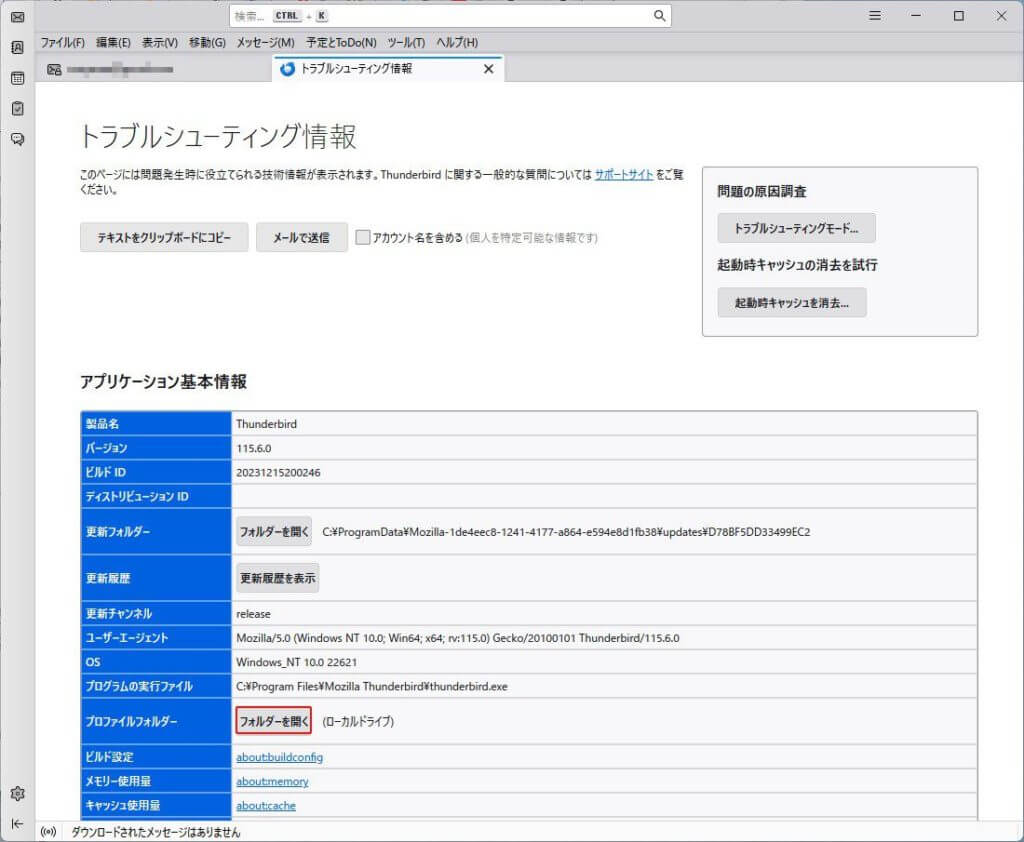 「トラブルシューティング情報(T)」を開いたら、下の図の赤枠の部分にあるプロファイルフォルダーの「フォルダーを開く」を押します。