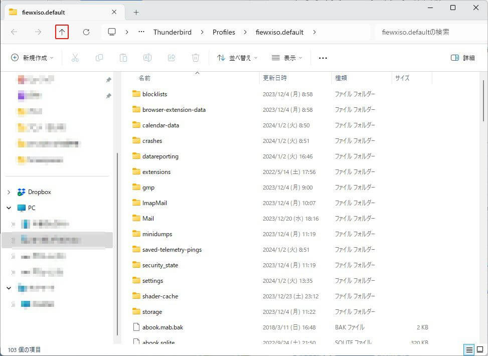 「フォルダーを開く」を押すとエクスプローラーが立ち上がりますので、下の図の赤枠の「↑」を3回押して、Thunderbirdのバックアップを行う元となるフォルダーへ移動します。