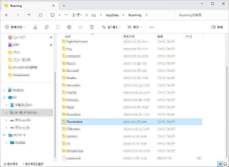 「Roaming」フォルダーの「Thunderbird」というフォルダーがバックアップすべきデータが入っているフォルダーとなります。