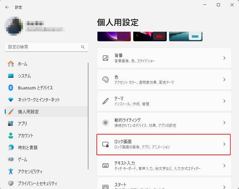 タスクバーのWindowsマークから「設定」を立ち上げ、「個人用設定」の中にある「ロック画面」をクリックします。