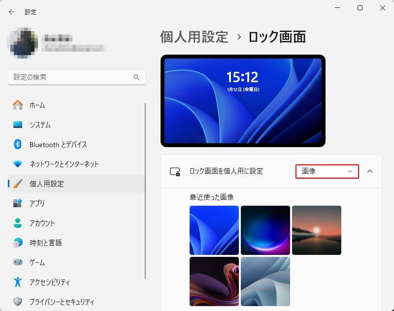 「ロック画面を個人用に設定」の部分を一旦、「Windowsスポットライト」から「画像」などに変更しておきます。