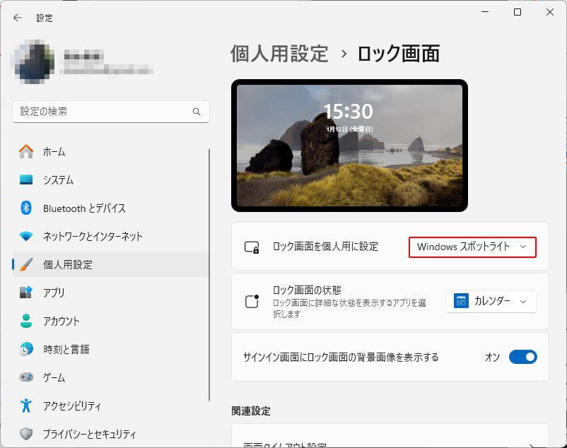 ロック画面の設定を「Windowsスポットライト」に戻す