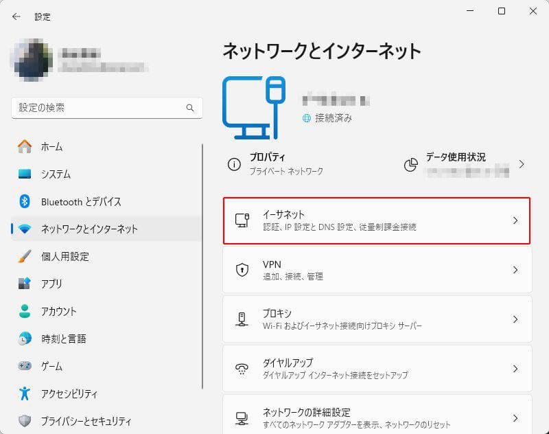 「ネットワークとインターネット」の「イーサネット」をクリックします。※ノートPCの場合はWi-Fiになっているかもしれません。とにかく、ネットの設定を開きます。