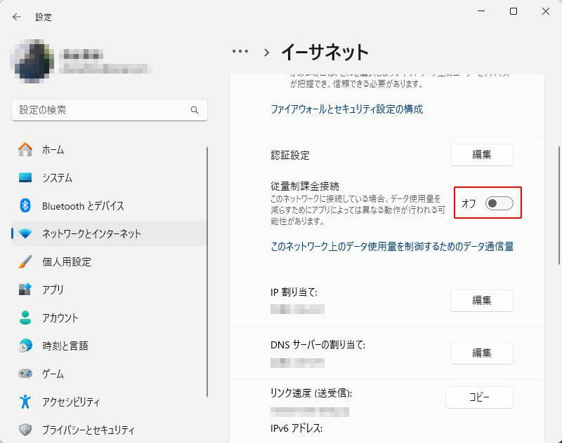 下図の赤枠で囲った部分のように、従量制課金接続を「オフ」にします。