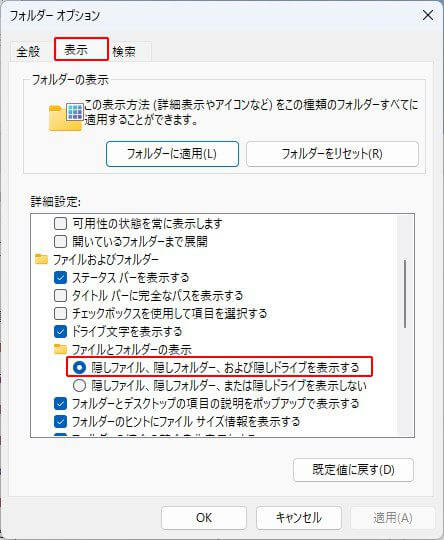 ※AppDataが無いという方もいらっしゃるかも知れません。それは、隠しフォルダを非表示の設定にしているためです。下図の表示の中の「隠しファイル、隠しフォルダー、および隠しドライブを表示する」にチェックをいれると表示されるようになります。