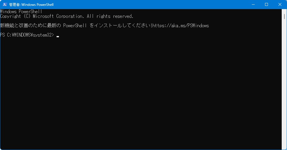 タスクバーの検索窓に「powershell」と入力し、「Windows PowerShell」を管理者として実行します。※管理者権限で実行できない環境であれば、一般ユーザーで立ち上げて構いません。