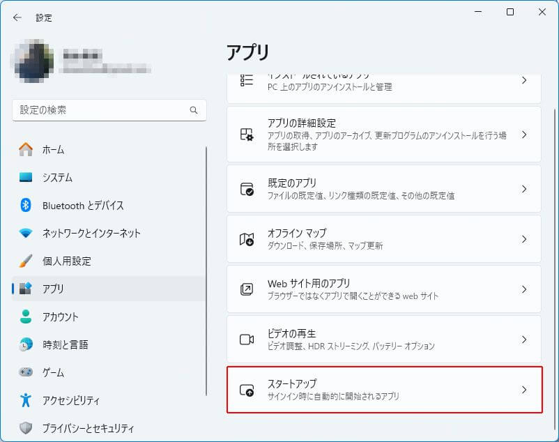 タスクバーのWindowsマークをクリックして設定を立ち上げます。次にアプリのスタートアップを開きます。