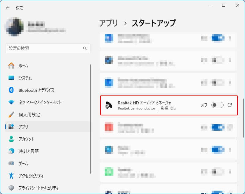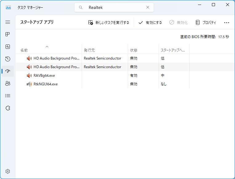 左側の「スタートアップ アプリ」をクリックし、検索窓から「Realtek」と検索します。出てきた「発行元がRealtek」のアプリをすべて「無効」にします。