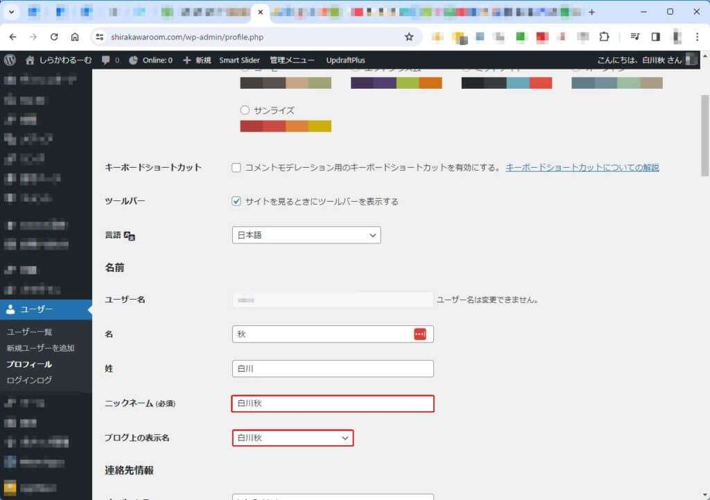 デフォルトではログイン時に使用しているユーザー名がそのまま投稿ベージなどに表示されてしまいます。これを防ぐために、管理画面の「ユーザー」>「プロフィール」からサイト上で表示するニックネームを設定しておきましょう。設定しておくことで、ユーザー名の変わりにニックネームが表示されるので安全です。ついでに、「ブログ上の表示名」もニックネームに変えておきます。