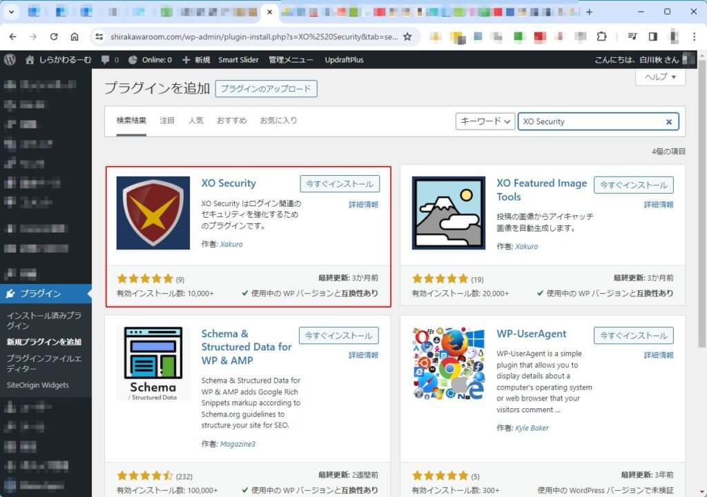 「プラグイン」の「新規プラグインを追加」の検索で「XO Security」と入力します。