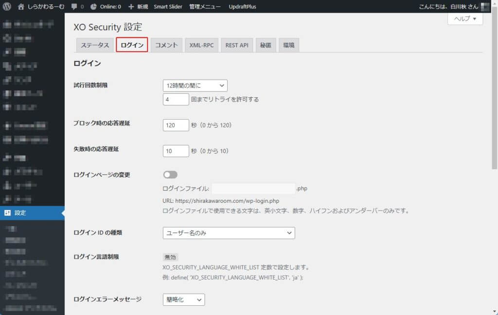 | ログインエラー メッセージ | 「デフォルト」 「簡略化」 おすすめの設定は 「簡略化」です。 「デフォルト」のままだとユーザー名が エラーメッセージから読み取られてしまう 危険性があります。 |