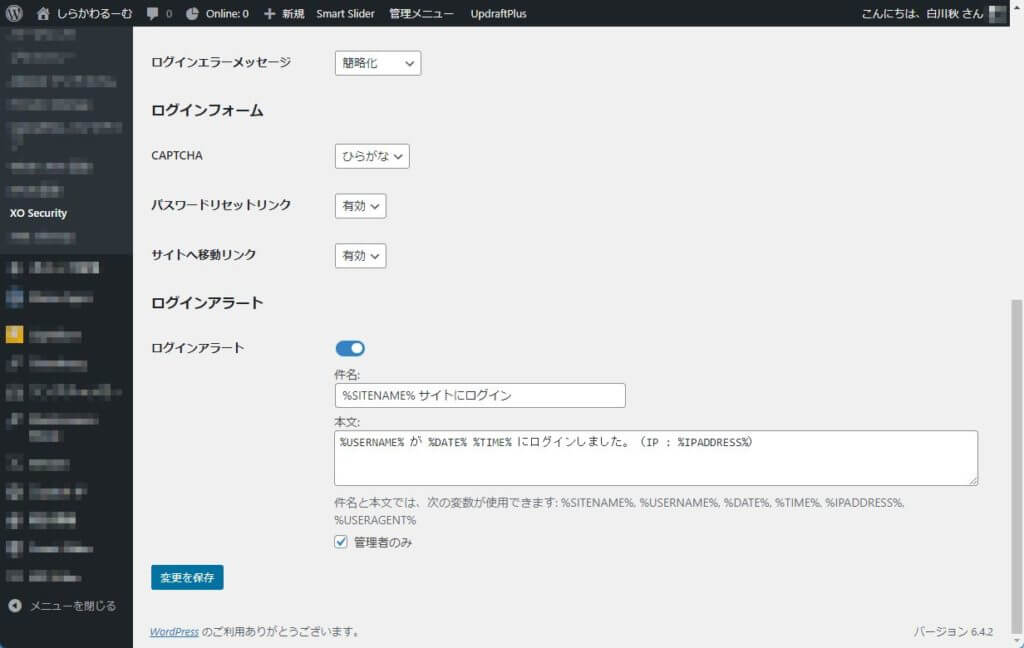 | ログイン アラート | 「オン」にしましょう。 不正なログインを検知するのに 役立ちます。 「管理者のみ」のチェックも 忘れないようにしましょう。 件名: 「%SITENAME% サイトにログイン」 本文: 「%USERNAME% が %DATE% %TIME% にログインしました。(IP : %IPADDRESS%)」 とします。 IPアドレスを出すようにすることで、 不正ログインなのか自分の操作によるものなのか がわかります。乗っ取りにあったとしても、 こちらのサイト(https://ja.ipshu.com/)に 知り得たIPアドレスを入力することで、 そのIPから管理会社を特定して管理者へ 連絡を取ることができます。 |