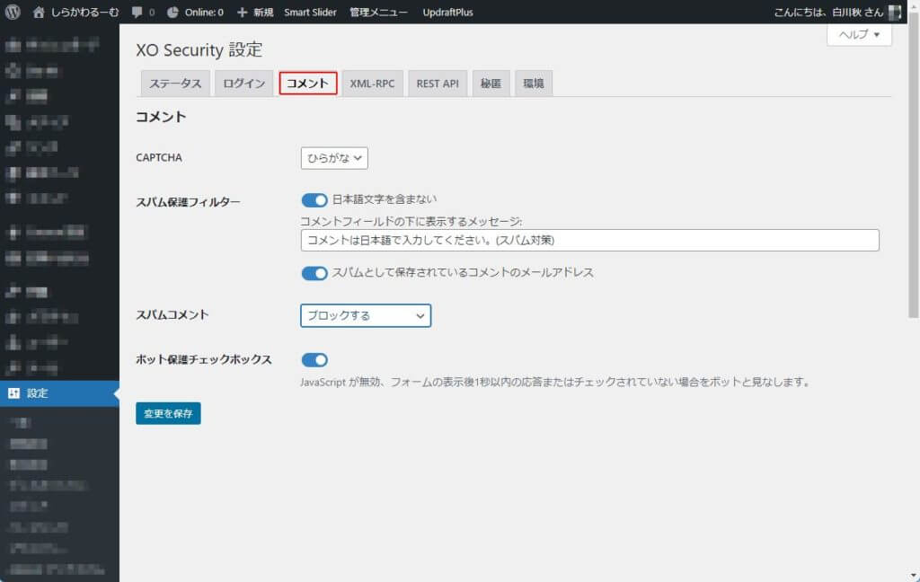 | ボット保護 チェックボックス | 「オン」にします。 コメントフォームに「私はロボットでは ありません。」という一文を添えた チェックボックスが追加されます。 |