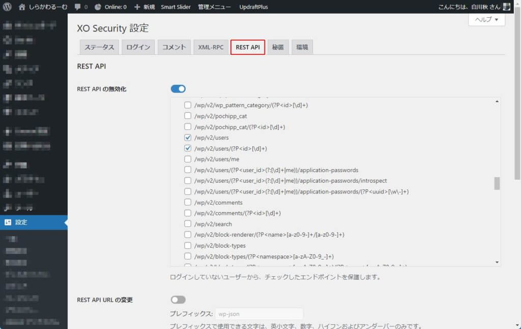 | REST API の無効化 | 「オン」にします。 「/wp/v2/users」 「/wp/v2/users/(?P<id>[\d]+)」 この2つにチェックを入れます。 このチェックを入れないとログイン時 のユーザー名が公開される恐れがあります。 「https://(ドメイン名)/wp-json/wp/v2/users」 と入力するとユーザー名が誰でも見れて しまうのです。 セキュリティー的にユーザー名は非公開である ほうが良いです。 |