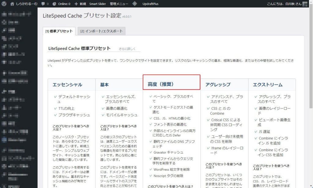 左のバーから「LiteSpeed Cache」>「プリセット」を開きます。