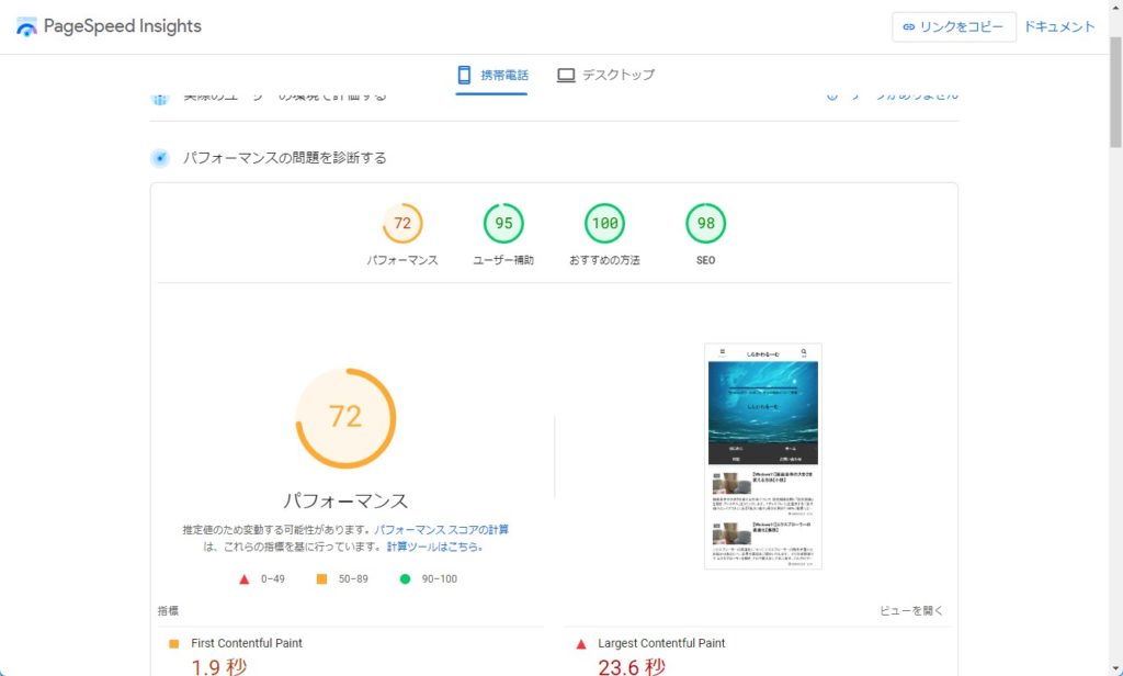 これでPageSpeed Insightsにアクセスして解析を行ってみると、パフォーマンスが劇的に改善されているはずです。