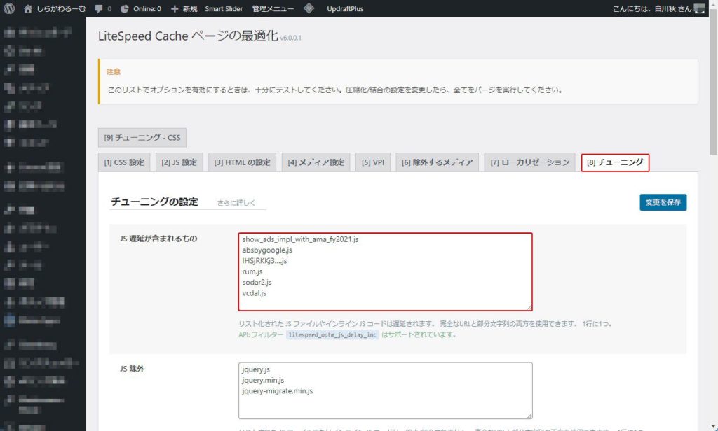 他にもちょこちょこいじったのですが、「LiteSpeed Cache」>「ページの最適化」から「[8]チューニング」を開き、PageSpeed Insightsのアクセス解析で警告が出た「JavaScript の実行にかかる時間」に出てくる「.jsファイル」を、「JS 遅延が含まれるもの」に放り込んでいくということでした。
