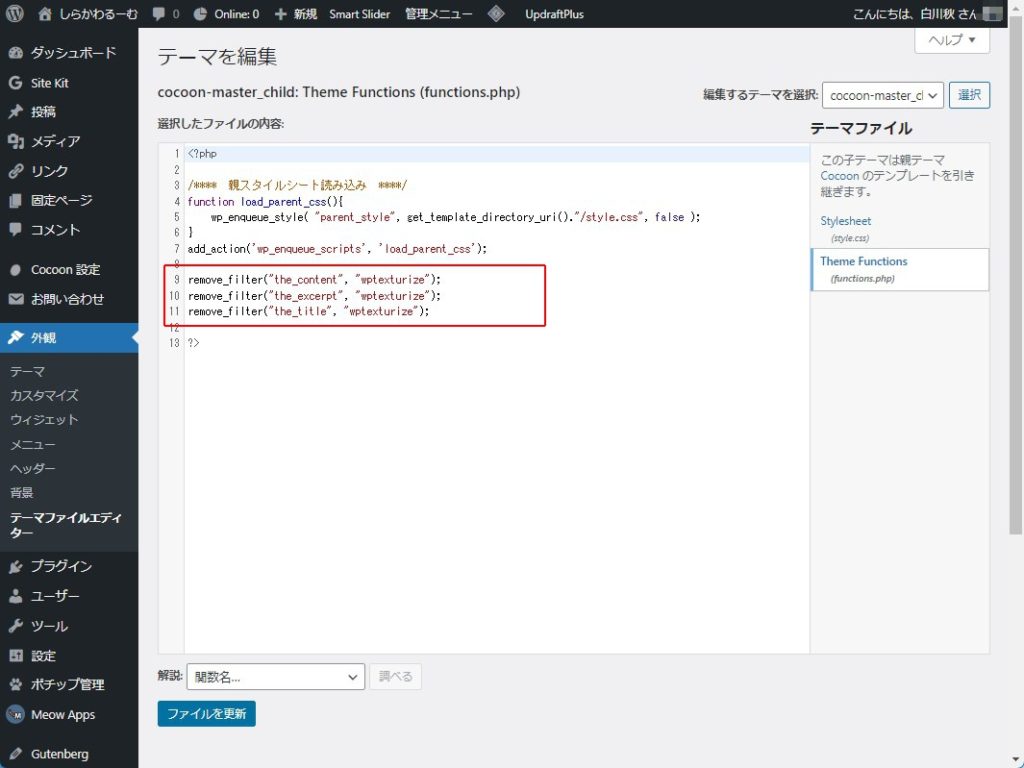 "wptexturize"は文章を自動変換させる機能を表し、この機能をremove_filterをかけることで、自動変換禁止とさせています。