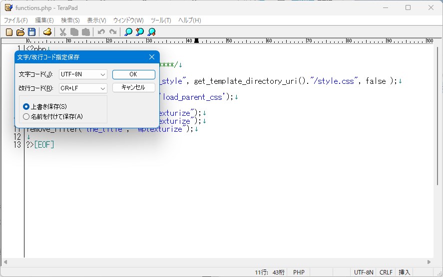 ここで注意が必要なのが保存方法です。「文字/改行コード指定保存」でファイルの保存を行います。このとき「UTF-8N」「CR+LF」を選択して保存してください。「UTF-8」というものもあるのに何故「UTF-8N」を選択するのか。それは、CSSやHTMLの文章を保存するときにはそうする決まりがあるからと覚えておいてください。「CR+LF」は改行をどの種類にするかということで、通常は「CR+LF」で構いません。