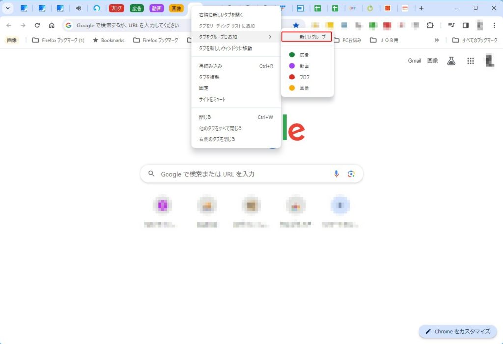 まず「その他」というグループに入れたいタブを右クリックし、「タブをグループに追加」>「新しいグループ」もしくは「タブを新しいグループに追加」をクリックしてください。※ここで「新しいグループ」の下にある「ブログ」「広告」「動画」「画像」を選択すると、そのグループにタブを入れることができます。また「タブを新しいグループに追加」と出るのはタブグループをひとつも作っていない場合です。