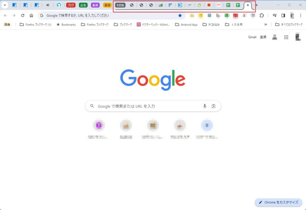 タブグループができましたら、「その他」タブグループへと入れたいタブを放り込んでいきます。(ドラッグ&ドロップ、もしくは入れたいタブを右クリックし「タブをグループに追加」から「その他」タブグループを選ぶことで移動できます)