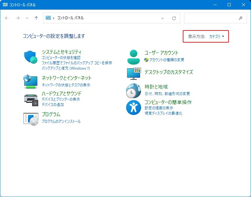 タスクバーの検索ボックスに「コントロールパネル」と打ち込み、コントロールパネルを立ち上げます。コントロールパネルの表示方法は「カテゴリ」にしておいてください。