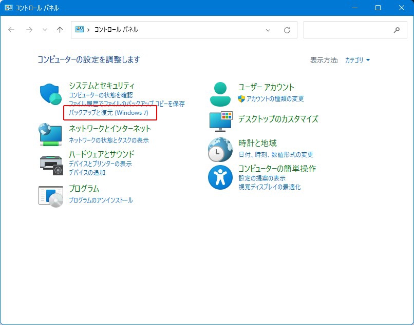 コントロールパネルの中の「システムとセキュリティ」の「バックアップと復元(Windows 7)」をクリックします。