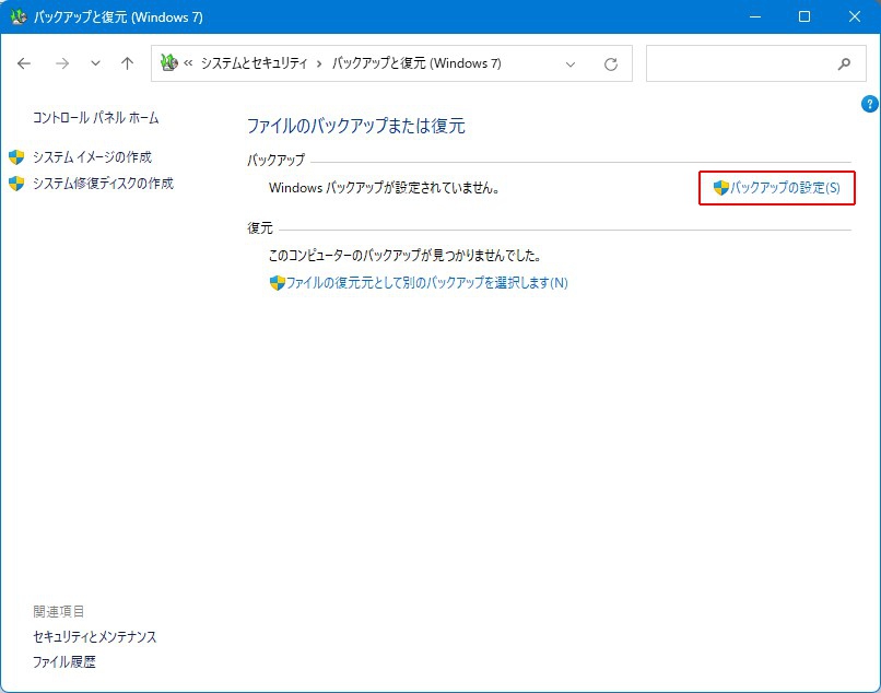 ファイルのバックアップまたは復元の「バックアップ」のところの「バックアップの設定(S)」をクリックします。