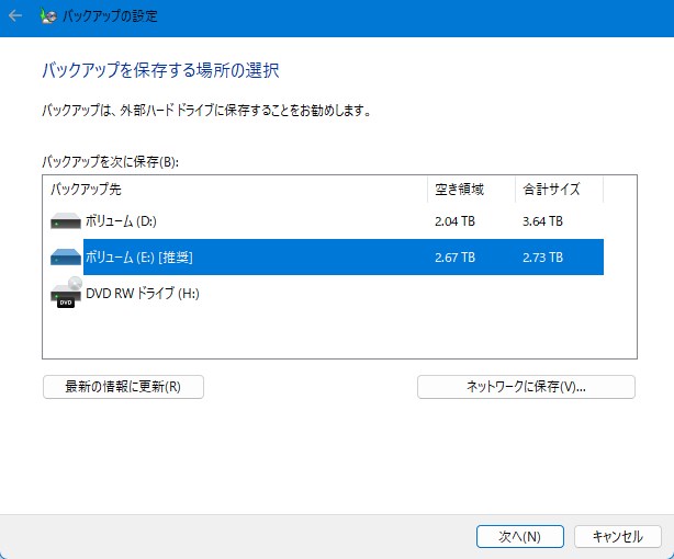 設定が終わると、次の画面になります。私の環境では「ボリューム(E:)」が推奨となっていますので、「ボリューム(E:)[推奨]」を選択して「次へ」を押します。