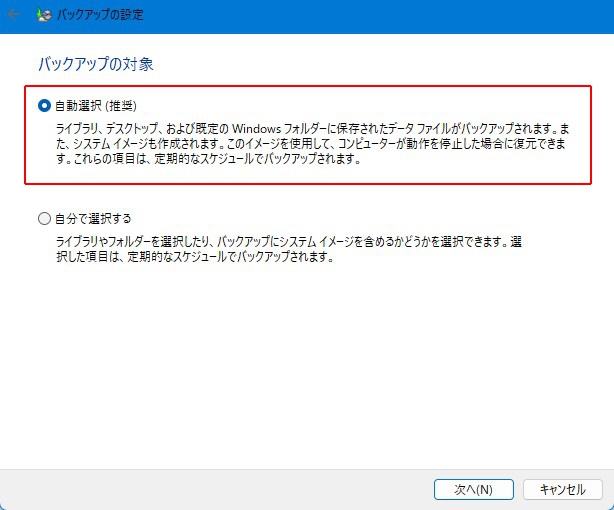 次の画面になりますので、「自動選択(推奨)」を選んで「次へ」をクリックします。