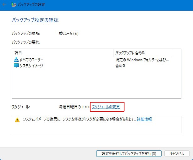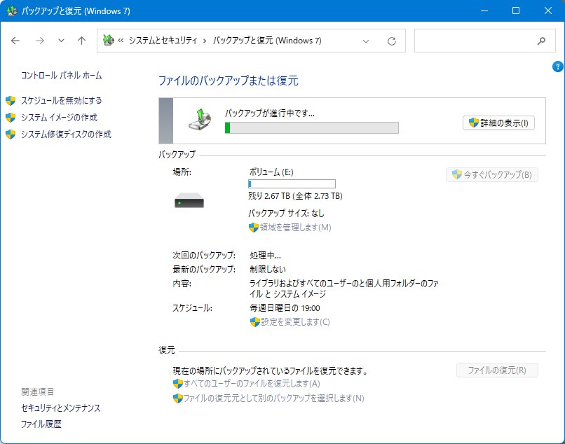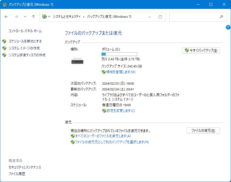 コントロールパネルのバックアップと復元で自動バックアップを作成