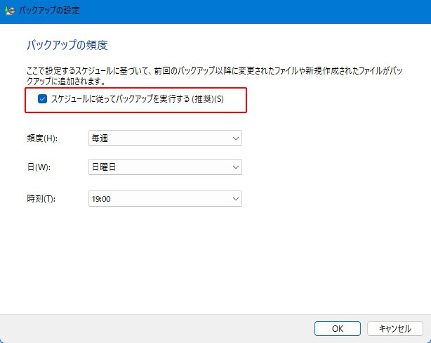 「スケジュールに従ってバックアップを実行する(推奨)(S)」のチェックを入れておきます。頻度は「毎週」、曜日はご自身の都合の良い時で「パソコンを開いていそうな曜日」、時刻は同じく「パソコンを開いていそうな時刻」に設定をします。設定できたら「OK」を押します。