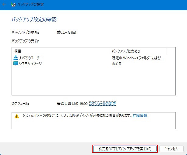 「設定を保存してバックアップを実行(S)」をクリックします。