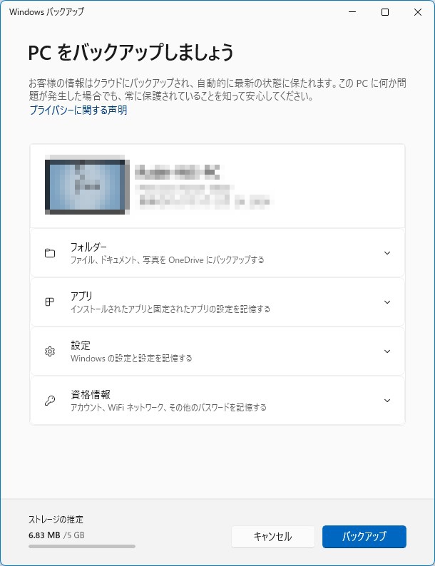 と、バックアップができますが、こちらの方法ではOneDriveに保存したり、それ以外はどこにバックアップしているのかよくわからない為、最初に紹介した方法をおすすめいたします。