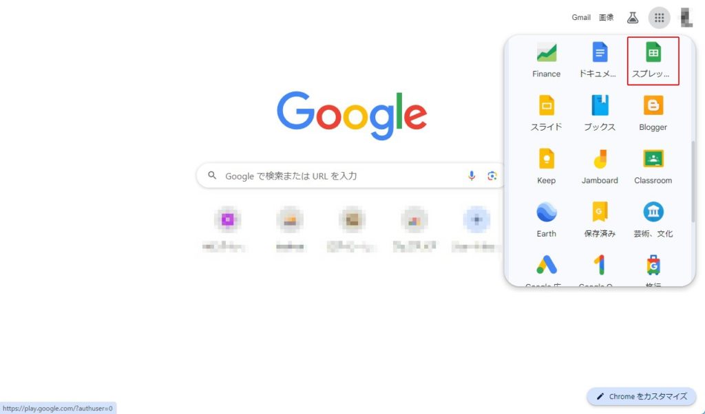 Googleのサイトを開き、右上の3つの「…」をクリックして、下にスクロールして出てくる「スプレッドシート」を選択します。