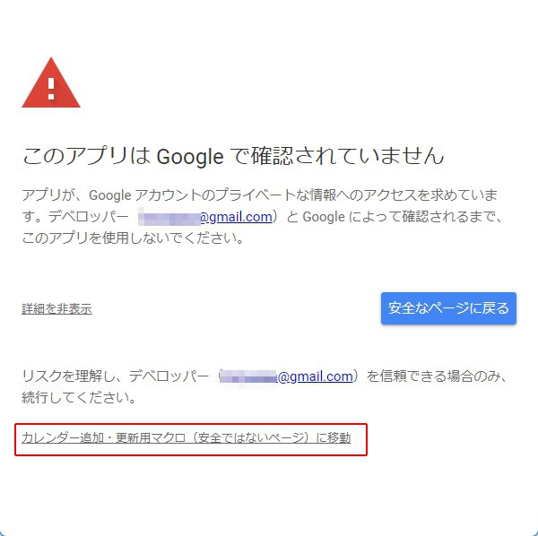 SpreadsheetApp.getUi().alert("カレンダーが取得できませんでした。カレンダーIDを確認してください。");