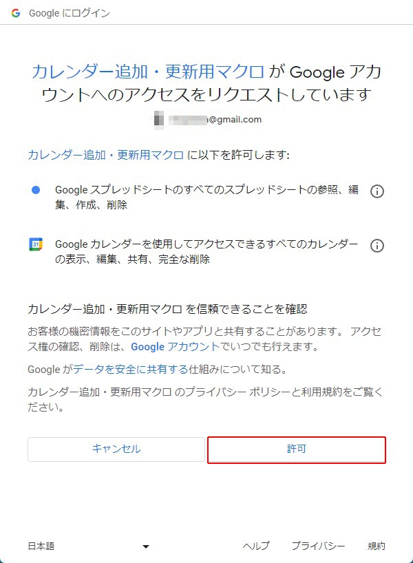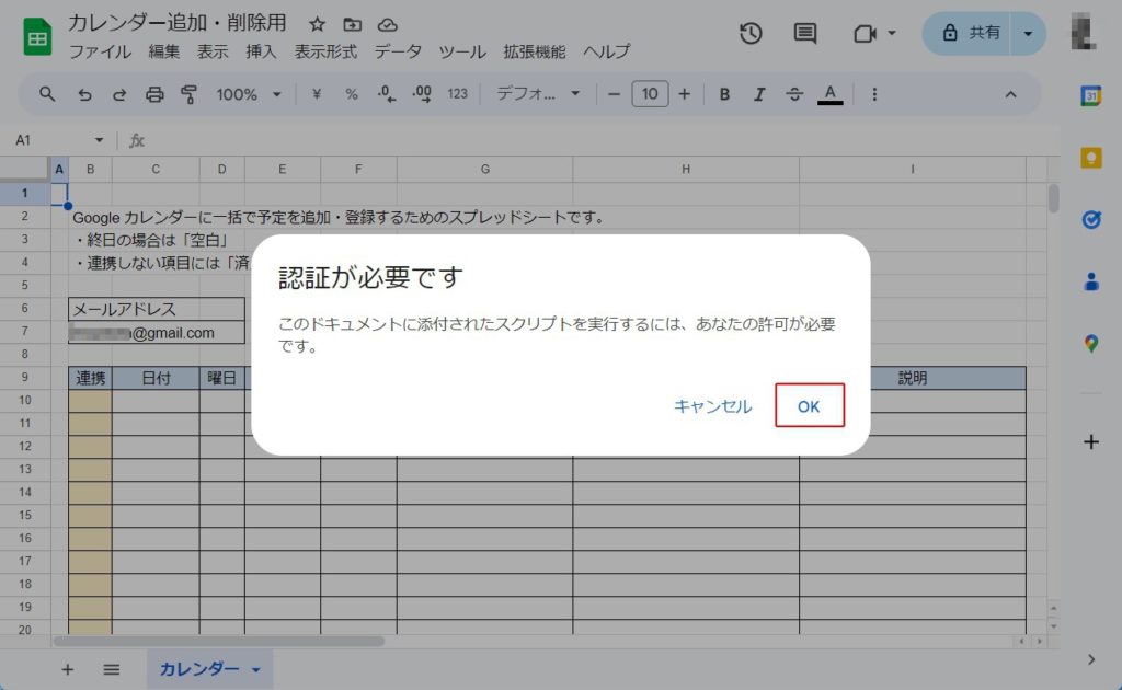 登録用に使用しているスプレッドシートのユーザーと、登録先のカレンダーのユーザーが異なる場合には、次の設定を行う必要があります。