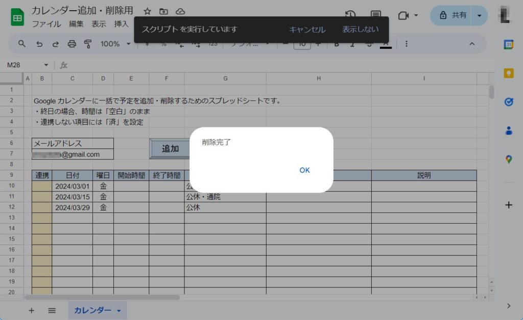 スプレッドシートを別アカウントに共有した際に、共有された側のアカウントで追加ボタンを押すとスクリプトは実行されるのですが、「済」の文字が追加されず、Googleカレンダーにも連携が行われません。