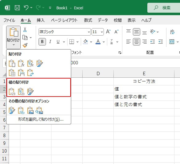 値と元の書式が貼り付けられたことがわかります。