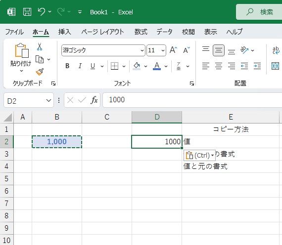 B2の内容を元に、D4に「値と元の書式」の貼り付けを行ってみます。